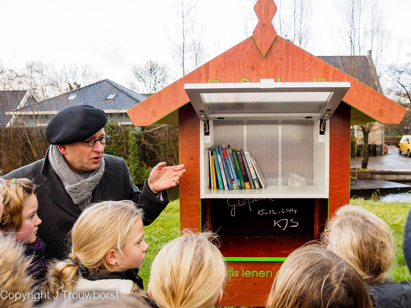 It is a small booklibrabry called Bookcote along the shellpath close to the road Lageweg and two large Open Pictureframes. The frames are painted by the schoolkids of Lageweg. Photo's are of Jan Trouwborst.