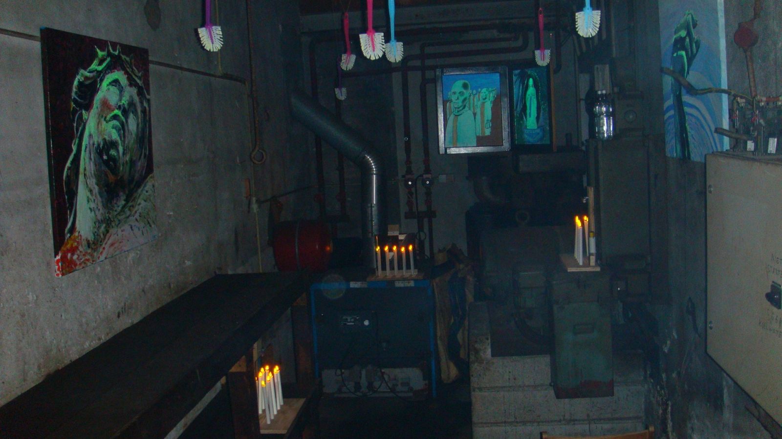 My journey to Lourdes located in the dark engineroom. I placed candles with blacklight, paintings with glow-in-the-dark paint, at the ceiling washingupbrushes dipted in glow-in-the-dark paint and visitors coming inside by opening the black curtain found wooden chairs, greorian singing and the smell of incense.
